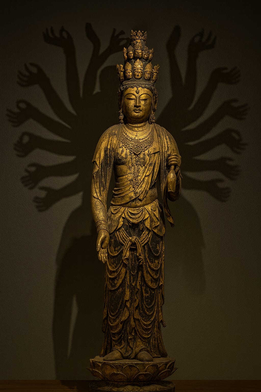 I first encountered an image of 11-headed Kannon in a gallery in the Metropolitan Museum of Art in New York City. It had been donated to the museum from a private collector who had acquired a number of artifacts from the Shingon Buddhist tradition (Japanese Vajrayana). The statue is larger than life, about 12 feet tall including its pedestal. In the past it would have been painted, probably gold, though it is 800 years old and it was been worn down to bare wood once again.